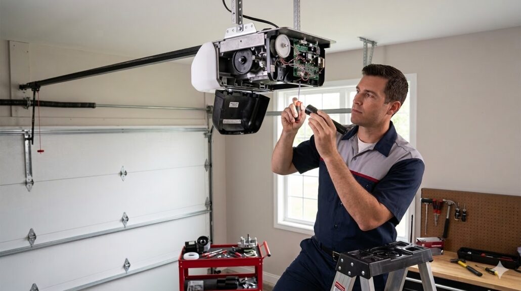 Technicians inspect the rail assembly, trolley carriage, and drive mechanism before recalibrating travel limits and safety reversal thresholds. Many homes use opener models comparable to those from Chamberlain, Genie, Sommer, and Linear, which operate with different drive systems and lifting capacities.